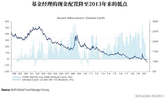 从资产配置也可看出美股投资者当前的状态。如下图所示,基金经理的现金配置比例降至3.8%,为2013年3月以来的最低水平。