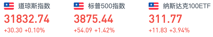 美股周二收高,纳指创4个月来最大日涨幅。周二道指涨30.30点,或0.10%,报31832.74点;纳指涨464.66点,或3.69%,报13073.82点;标普500指数涨54.09点,或1.42%,报3875.44点。