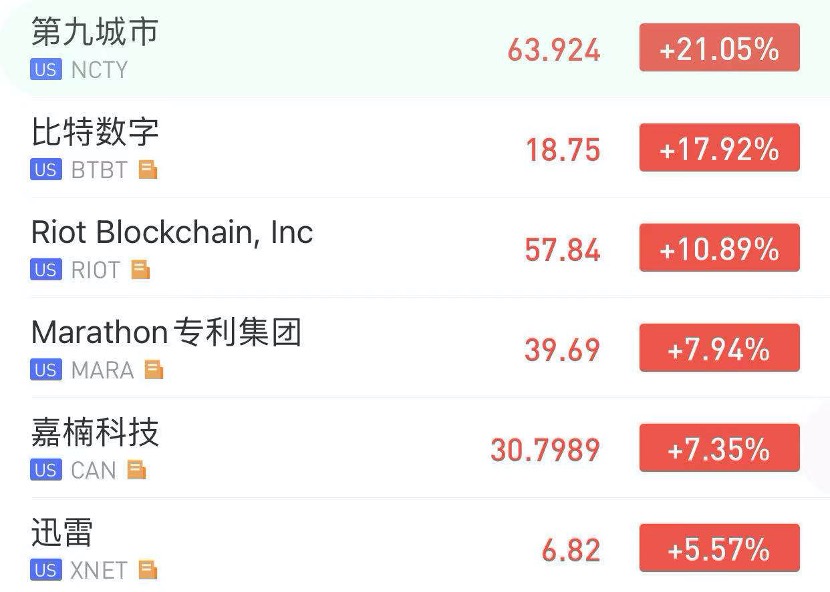 截至发稿,第九城市涨超21%,比特数字涨近18%,Riot涨超10%,嘉楠科技涨超7%。