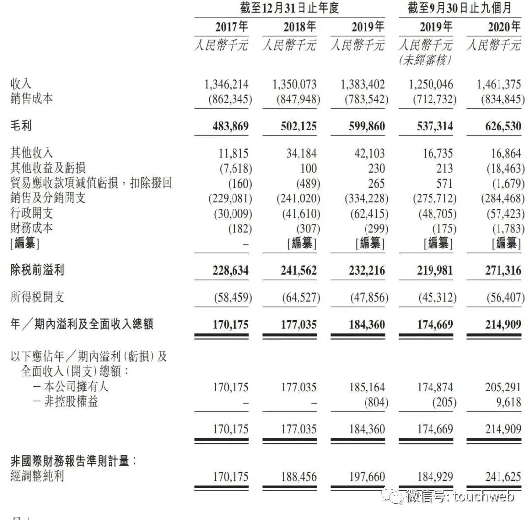 朝云集团2017年、2018年、2019年营收分别为13.46亿元、13.5亿元、13.83亿元;期内利润分别为1.7亿元、1.77亿、1.84亿元;经调整利润分别为1.7亿元、1.88亿元、1.98亿元。
