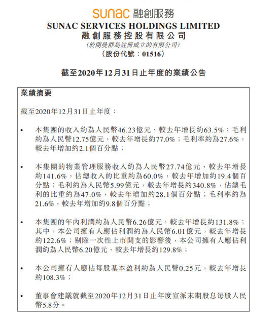 3月11日消息,融创服务在港交所公告称,截至2020年12月31日止年度,集团的收入约为46.23亿元,较去年增长约63.5%;毛利约为12.75亿元,较去年增长约77.0%;毛利率约为27.6%,较去年增加约2.1个百分点。
