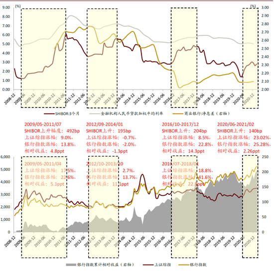 图表: 市场利率上行周期通常将推高贷款利率,推动净息差趋势性扩张;前三轮利率上行周期中 A股银行录得绝对收益 和相对收益的概率均为 2/3 ,我们认为此轮周期与 2016-2018年周期更像,银行有望录得大幅绝对收益和相对收益