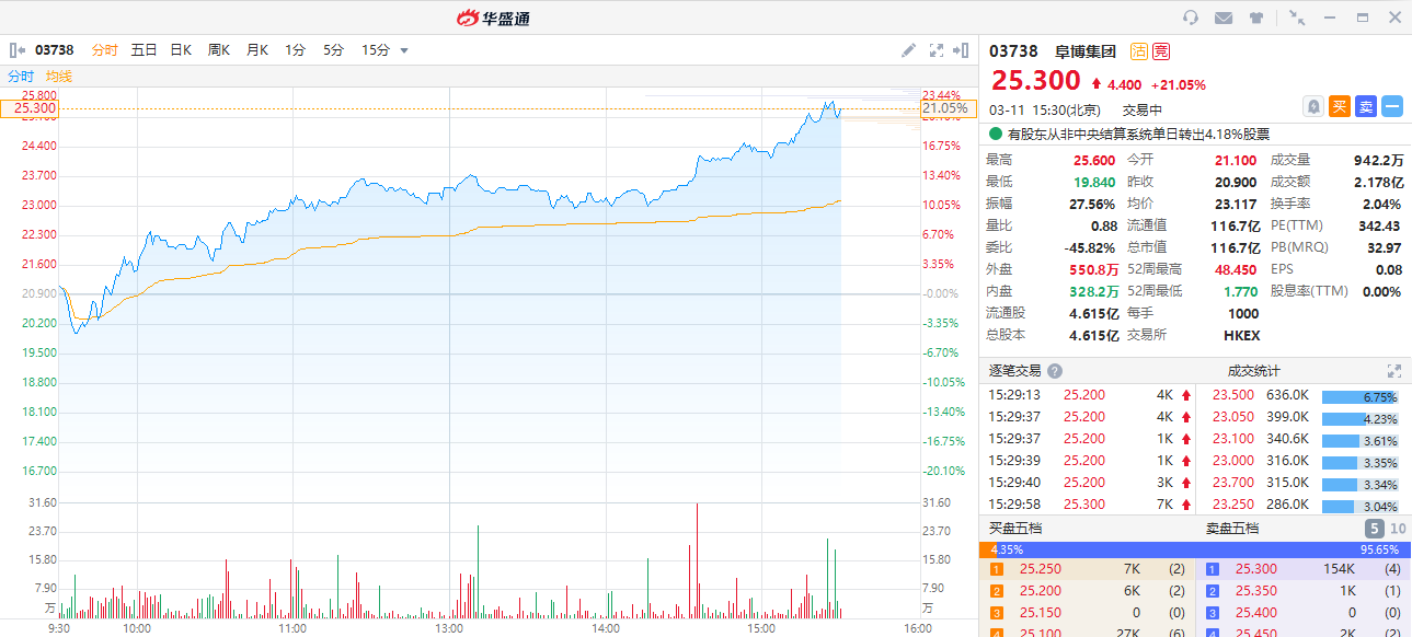华盛资讯3月11日消息,阜博集团早盘微跌后转涨,股价一路飙升。截至发稿,阜博大涨21%,现报25.3港元每股,成交额达2.178亿,当前总市值为116.7亿。