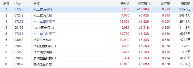 受市场消息影响,今日港股涨幅居前的ETF主要有南方两倍做多恒科ETF大涨10.98%,成交额2.10亿港元;南方两倍做多A50ETF涨5.92%。