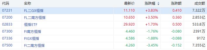 看空恒指相关ETF走弱,其中南方两倍看空恒指(07500.HK)跌3.45%,成交额7.36亿港元;南方一倍看空恒指(07300.HK)跌1.76%,成交额2391万港元。