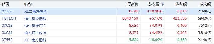 今日恒生科技指数大涨5.16%。其中,南方两倍做多恒科(07226.HK)涨10.98%,成交额2.10亿港元;做空两倍南方恒科跌10.09%,成交额2.14亿港元。