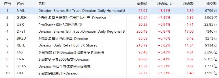 昨日美股三大指数涨跌不一,道指涨逾460点再创历史新高。从ETF涨幅榜来看,涨幅居前主要是能源和做多指数类的ETF相关,其中,2倍做多每日标普油气出口与生产大涨7.39%,成交额1.97亿美元;2倍看多每日巴西股票的ETF涨6.76%。