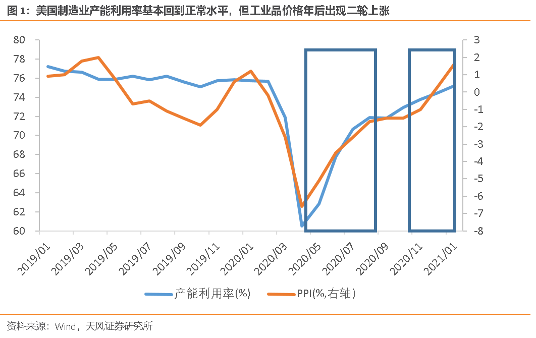 2021年1月美国制造业产能利用率已从上年4月的历史最低点60.5%恢复至75.2%,同比下滑0.5%,基本回到了正常水平;但供需错配的结构性问题仍然明显,工业品价格出现了二轮上涨。