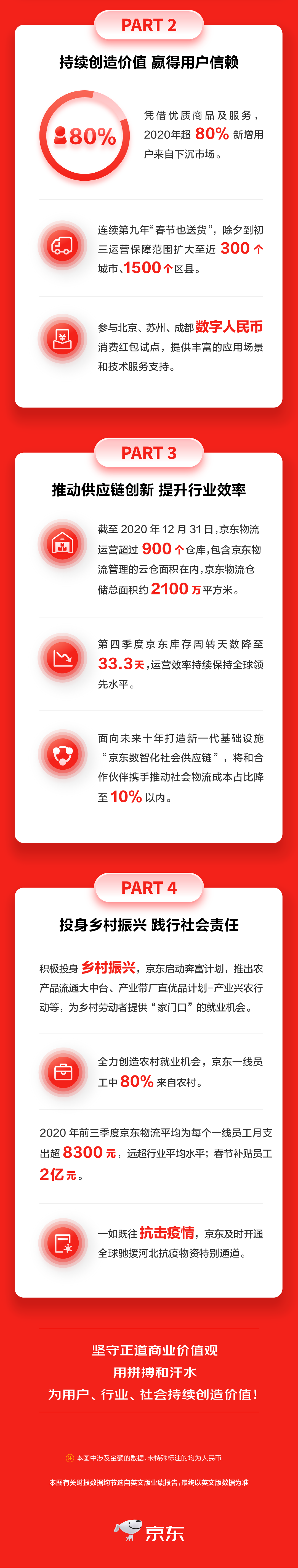 “尽管市场环境依然充满挑战,但在公司的长期经营理念和以客户为中心的价值定位推动下,京东第四季度收入和用户数量均实现了加速增长,”京东集团董事会主席兼首席执行官刘强东先生表示,“本季度,京东持续推进以供应链为基础的技术与服务战略,不断丰富公司收入的多样性。公司强劲的发展势头在进入2021年以来得以延续,同时,京东也将积极响应市场发展和需求的变化,并持续投资于创新、高增长潜力的业务,以助力公司长期可持续地增长。”