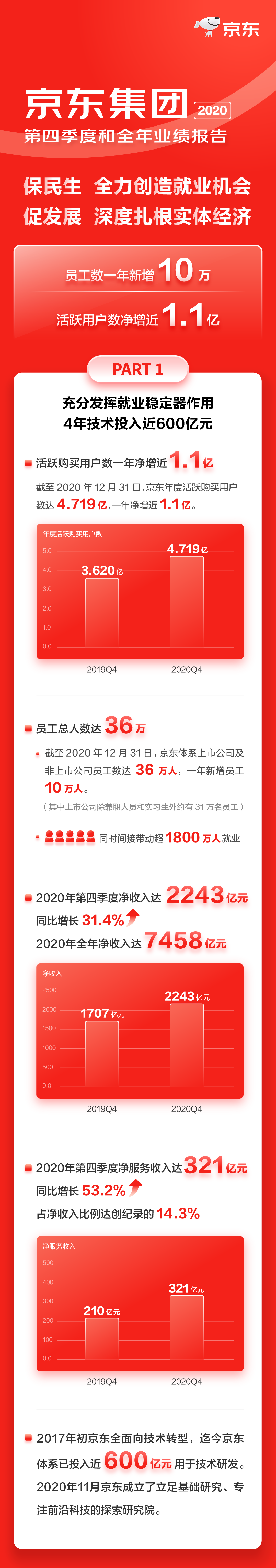 京东公布全年业绩,2020年第四季度净收入为2243亿元人民币(约344亿美元),同比增长31.4%。2020年第四季度净服务收入为321亿元人民币(约49亿美元),同比增长53.2%。