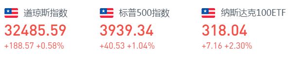 周四道指涨188.57点,或0.58%,报32485.59点;纳指涨329.84点,或2.52%,报13398.67点;标普500指数涨40.53点,或1.04%,报3939.34点。