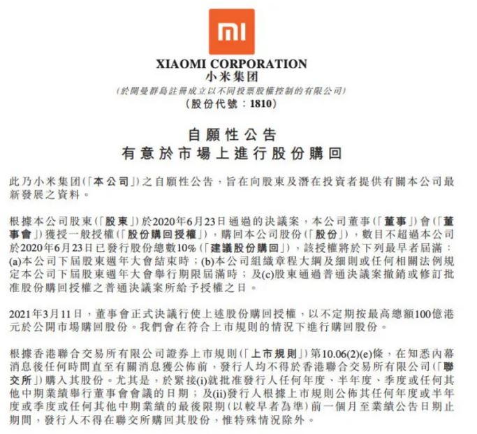 小米发公告:将不定期回购100亿港元股份