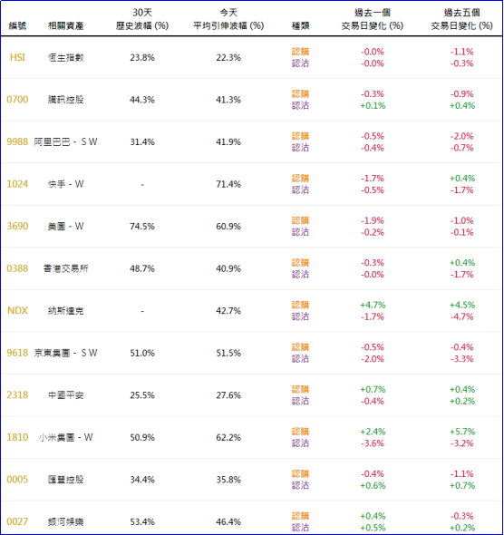 周四恒指相关权证的平均引伸波幅报约22.3%,继续按日下降。个股方面,快手、美团、阿里相关权证的引伸波幅均按日回调;小米、平安、银河相关认购证的引伸波幅则有所调升。