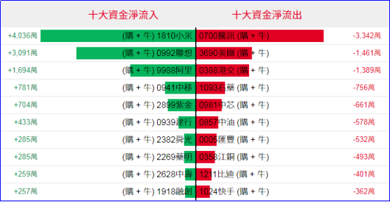 好仓(认购证及牛证)方面,周四小米、联想、阿里相关好仓分别约4036万、3091万及1694万港元资金净流入部署;腾讯、美团、港交所相关好仓则分别约3342万、1461万及1389万港元资金净流出套现。