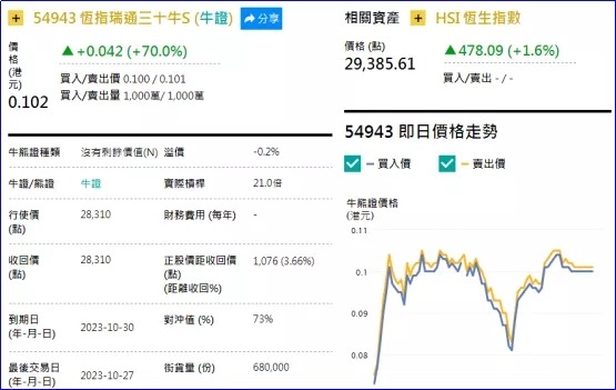 1、强势轮证:恒指瑞通三十牛(54943.HK),周四上涨70.00%;