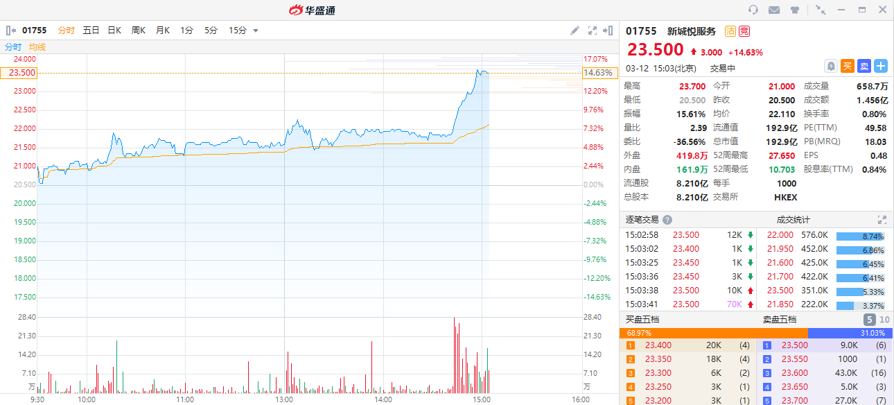 华盛资讯3月12日消息,新城悦服务盘中异动,股价快速拉升超15%,创本月新高。中午曾发布2020年业绩报告。截至发稿,新城悦服务涨14.63%,现报23.5港元每股,暂成交1.456亿,当前总市值为192.9亿港元。