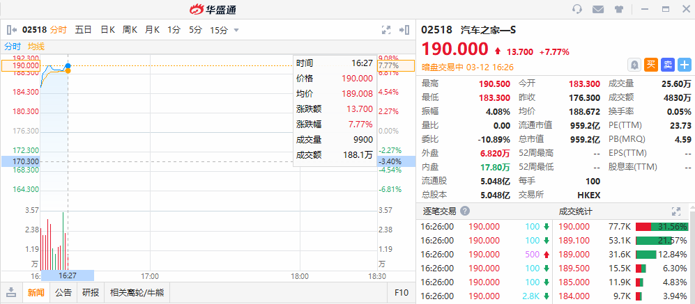 汽车消费者在线服务平台汽车之家—S(06601.HK)暗盘交易正在进行,该股高开3.97%,截至16:26报价190.00港元,较发行价176.3港元涨7.77%,每手盈利1370港元,当前成交量25.60万,成交额4830万港元。该股将于下周一上市。