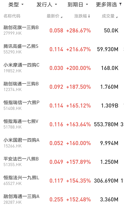 融创花旗一三购B(27999)涨286.67%占据涨幅榜第一,但成交额不大。其次是腾讯高盛一乙熊S(55290)涨216.67%、小米摩通一四购C(19852)涨200%。