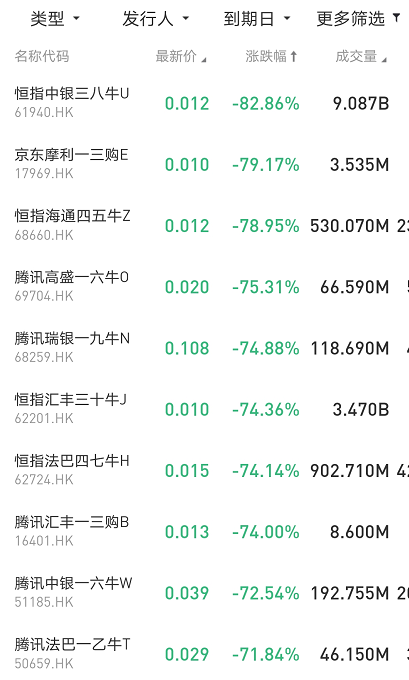 在今日跌幅榜中,恒指中银三八牛U(61940)跌82.86%;京东摩利一三购E(17969)大跌79.17%。