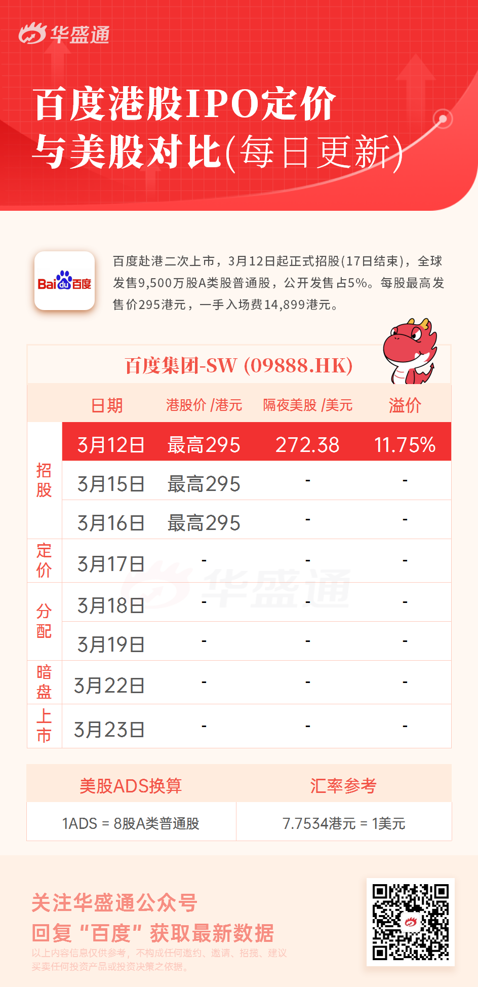 华盛资讯将每日跟踪百度港美股溢价情况,扫码关注华盛通公众号,或前往华盛通APP新股中心-新股动态,可获取最新数据: