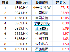 个股资金流向统计:抄底小米27亿港元,加仓中国移动、中国宏桥、思摩尔国际
