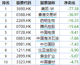 本周,南下资金抛售美团77.38亿港元,位列抛售额第一。此外,南下资金抛售香港交易所36.97亿港元,位列抛售额第二。药明生物、腾讯控股、中国电信、中国海洋石油、中芯国际、比亚迪股份、紫金矿业等个股也遭到内资抛售。