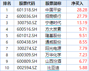 此外,北上资金净买入招商银行27.79亿元,净买入宁德时代13.19亿元。方大炭素、隆基股份、通威股份、阳光电源、万华化学、山西汾酒、比亚迪等个股也获得港资加仓。