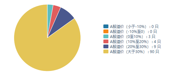 本周共有90只A股溢价超过30%,有9只A股溢价在20%-30%之间,有4只A股溢价在10%-20%之间,有3只A股溢价在10%以内。