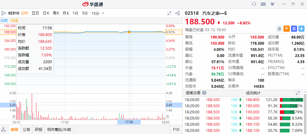 华盛资讯3月12日讯,汽车之家—S暗盘收报188.50港元,较发行价176.30港元上涨6.92%,每手账面盈利1220港元。收盘成交额1.260亿港元,最新总市值为951.6亿港元,该股将于下周一3月15日正式上市。