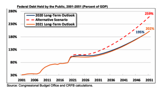 然而实际债务水平可能比CBO预算的更高。未来,立法者可能会通过一项2万亿美元的新冠疫情救助法案,延长即将到期的减税政策,以及在增加每年的经济拨款的同时控制通胀率,在这样的情况下,到2051年,美国债务将达GDP的259%。