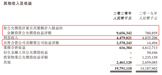 同期,出售联营、合营公司的收益约25.78亿元,较2019年底的1449.4万元,暴增176.8倍。这两项收益合计约122.34亿元。