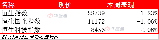 恒生指数周跌1.23%,报28739;恒生科技指数周跌2.06%,报8456;国企指数周跌1.06%,报11172。