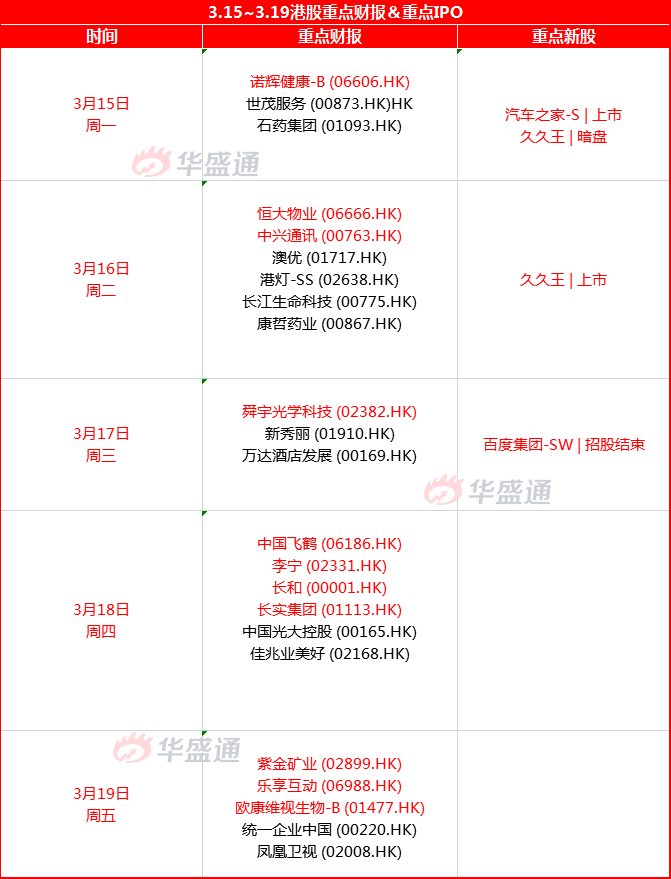 财报方面,下周一诺辉健康、世茂服务等发布财报,周二恒大物业、中兴通讯发布财报,周三舜宇光学披露财报,周四中国飞鹤、李宁、长和发布财报,周五紫金矿业、乐享互动等披露财报。