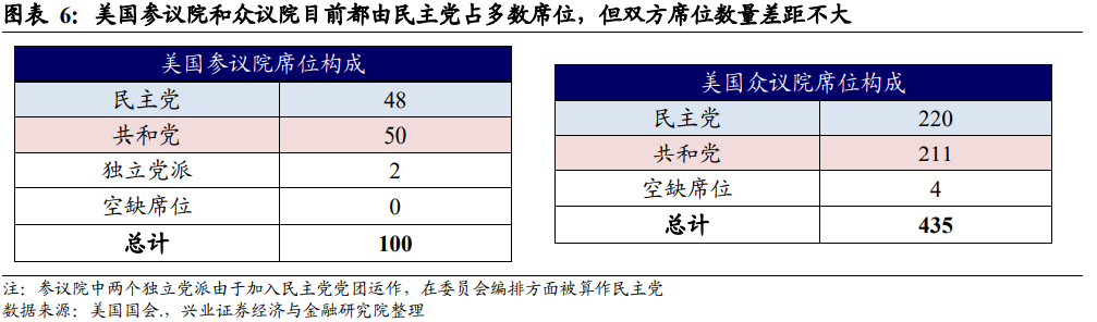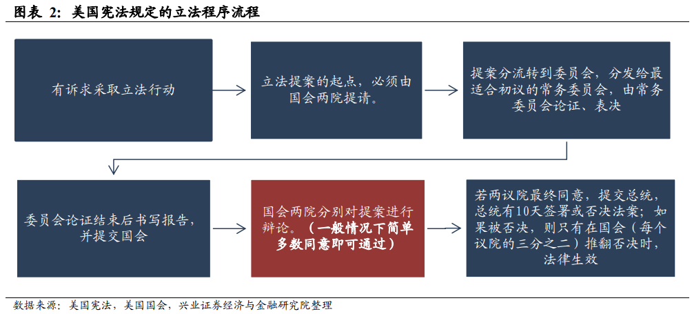 立法主要障碍:或需通过调和程序绕开参议院议事阻碍。需要注意的是,少数党参议员可以通过“议事阻碍”(filibuster)无限延长发言时间来阻止投票的进行,而只有达到60票才可以终止辩论。“调和程序”(reconciliation)能够有效绕开议事阻碍,只需要简单多数同意即可通过法案。近期通过的1.9万亿财政刺激就是使用“调和程序”,在共和党议员零票支持的背景下顺利立法。
