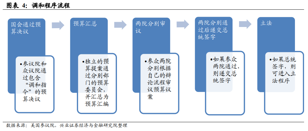 “调和程序”(reconciliation)能够有效绕开议事阻碍,将参议院的辩论时间限制在20小时之内,且只需要简单多数同意即可通过法案。从流程上来看,调和程序的流程并不复杂,因此使用调和程序通过基建计划可能为拜登政府的最优解。