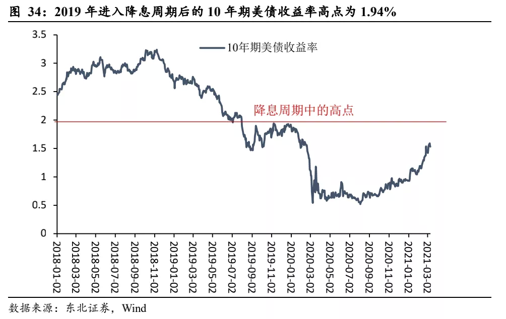在经济初步复苏、美国财政压力较大、金融市场尚不稳定的情况下,美联储对美债收益率上行的容忍度显然不会是无限的。那么美联储的底线在哪儿呢?根据12月会议纪要的表态,本次货币政策退出的路径将如2013-2014年,即逐步缩减QE,目的是防止2013年的“缩减恐慌”重演。2013年伯南克退出QE的态度引发了美债收益率快速上行,进而造成全球金融市场动荡,这是当前美联储不愿看到的。那么2013年美债收益率反弹了多少呢?从低点到高点为138bp。本轮美债收益率的反弹起点为去年8月的0.52%,假如反弹同样的幅度,则最终可至1.9%。