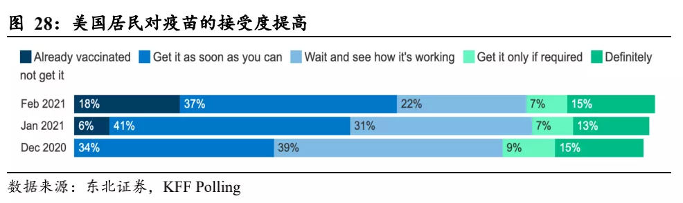 再次,民调机构KFF Polling的数据显示,近几个月来美国居民的接种意愿有所上升,“已经接种”和“希望尽快接种”的人数比例均提高。即随着接种的进行,越来越多的人对疫苗的认可度提高,这也将降低疫苗普及的阻力,有助于实现群体免疫。