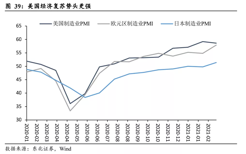 第二,今年美元经济势头较其他发达经济体更强劲。在疫情后的经济复苏时期中,美国经济恢复较其他主要发达国家更快,从PMI指数来看近几个月远高于欧洲和日本(2月由于寒潮原因才有所下降)。今年美国经济复苏的动能也较其它发达国家更强,对美元有基本面支撑。