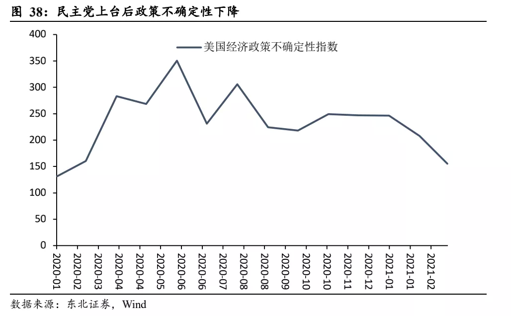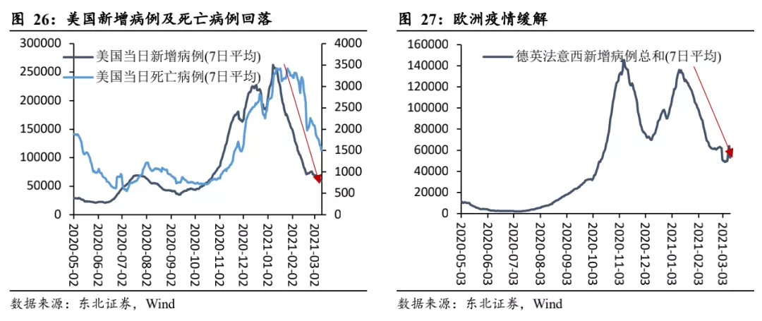 在过去一年中,新冠疫情始终是悬在美国经济上方的达摩克利斯之剑,每次重启经济都会引发更大规模的疫情爆发。但今年1月以来,秋冬季爆发的新一轮疫情见顶回落,全球其它国家和地区的疫情也得到缓解。我们认为新增病例的下降大概率是趋势性的,未来难有再反弹,经济前景的不确定性大大下降。