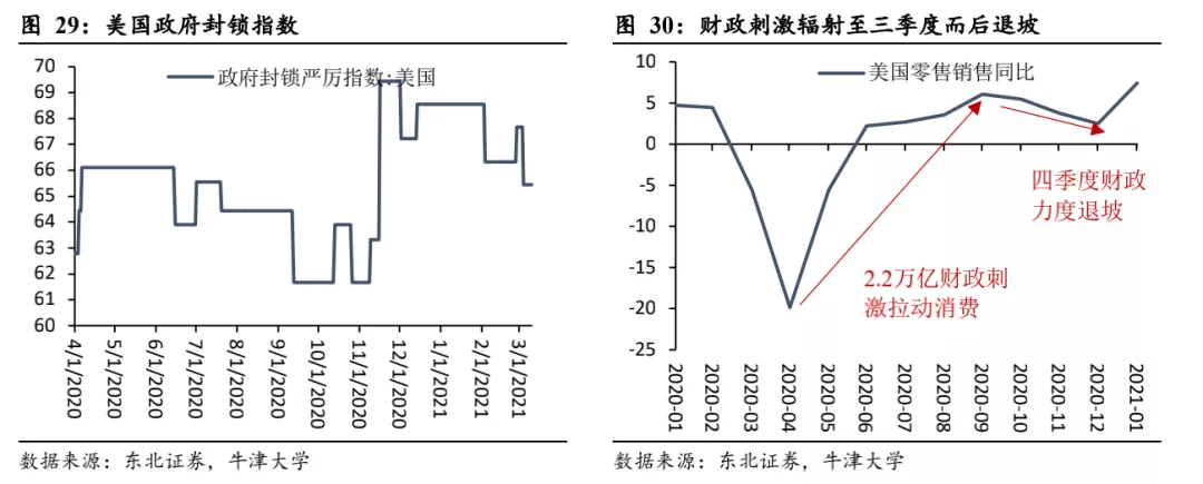 由上文的推算,我们的基本假设是美国能在年中左右实现群体免疫,三季度有望全面解封,疫情的不确定性消除,经济复苏畅通无阻。节奏上,我们认为一二季度复苏拾级而上,在群体免疫之前,拜登政府难以全面开放经济。英国首相约翰逊近期公布的解封计划来看,经济全面重启将在7月才能实现,而美国当前的封锁方式与欧洲相近,预计在上半年难以全面开放,故而经济的高点要在下半年才能出现。我们认为美国经济将在三季度达到最高点,四季度稍有回落。因为三季度随着经济的开放,服务业复苏的斜率可能达到最高。同时从去年财政刺激的经验来看,财政影响力能够持续至三季度达到高点,而四季度则明显下降。本轮1.9万亿财政刺激的推出时间和规模与去年CARES法案相似,其影响应该能辐射至三季度,而四季度则有较大的财政退坡的压力。而且四季度美国补库存周期可能接近尾声,经济动能将会趋缓。
