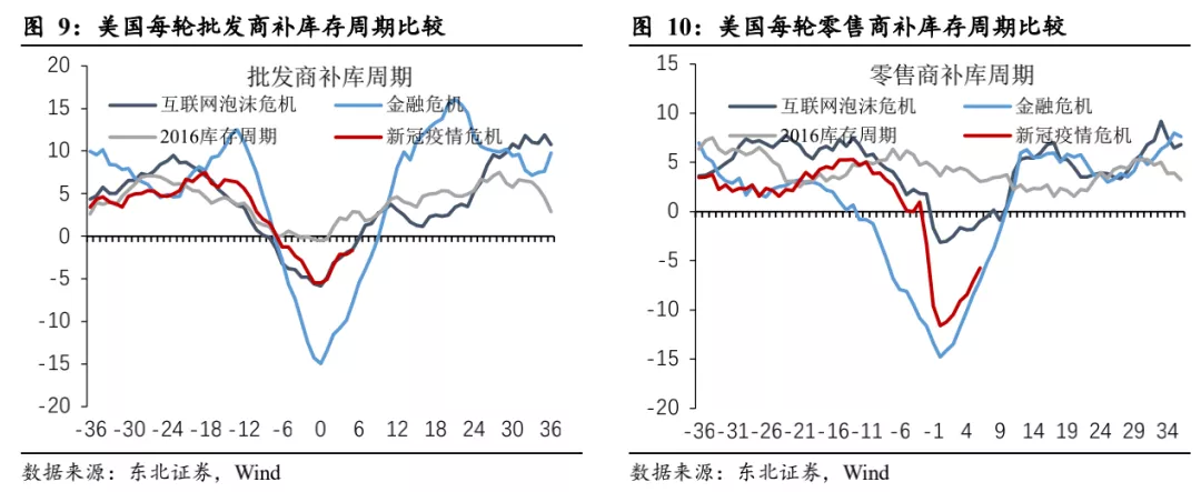 过去20年间比较典型的几次库存周期分别在互联网泡沫之后,金融危机之后,2016年全球共振补库及去年新冠疫情后开启的新一轮库存周期。除2016年的库存周期外,其它几轮周期的特点均为经济危机导致库存水平降至非常低的位置。其中金融危机后库存去化程度最深,补库持续的时间也相对更长。2016年的库存周期中经济没有经历明显衰退,库存去化程度最浅。本轮制造业补库周期中,制造商库存、批发商库存和零售商库存呈现出明显的分化,这是由于美国的疫情防控和财政刺激造成了“消费强、生产弱”的特点,与终端消费相关的零售商库存快速下降,而制造商库存则由于开工受阻而降幅较小。