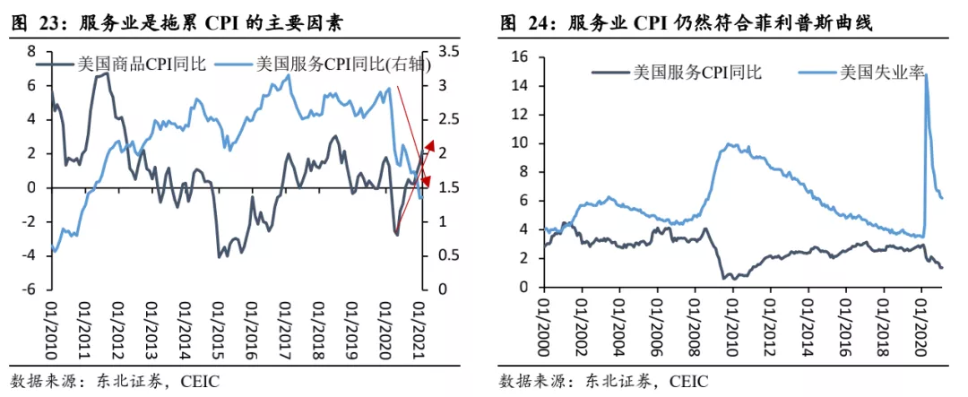 美国服务类CPI仍然符合“菲利普斯曲线”。虽然整体CPI与失业率的相关性弱化,但这主要因为商品类CPI受到了全球化进程带来的廉价进口商品的冲击,而服务业大多是不可贸易部门,其价格的主要驱动力依然是国内居民的消费能力,而这是与就业形势密切相关的。去年4月以来美国失业率快速下降,但由于消费场景的缺失,服务类CPI并没有随之回升。我们认为随着下半年随着服务业的复苏和失业率的继续下行,服务类CPI将回归至2%以上,或将接近3%,成为拉动CPI的重要增量。