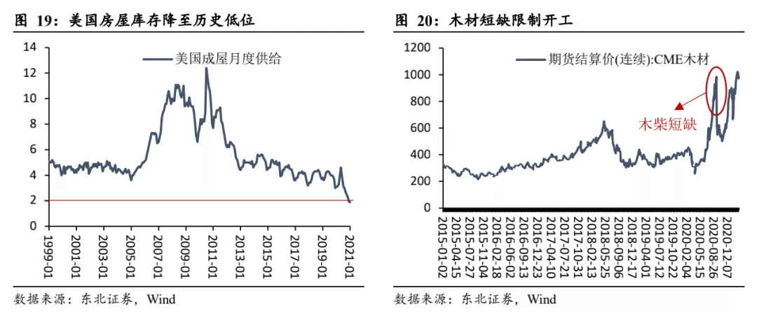 在房屋的火热销售之下,美国房屋库存迅速降至历史低点,补库存迫在眉睫。但美国房地产补库存的进程并不顺利,去年二三季度由于疫情封锁导致木材运输受阻,根据NAHB,美国独立住宅的房屋架构中木材占比达到93%,是建房不可或缺的重要材料。后来又由于疫情反复爆发阻碍开工、以及寒潮等原因,房屋建造再度受阻。
