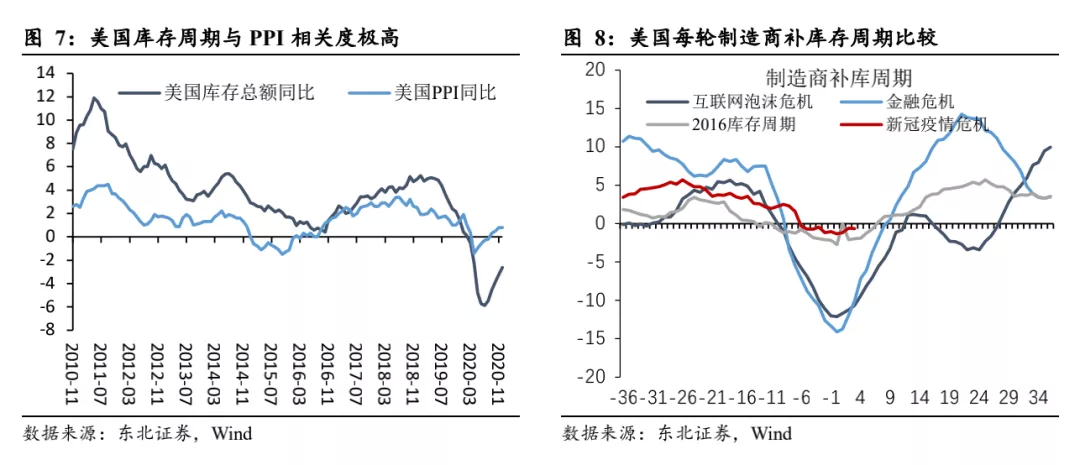 全球货币政策的松紧决定了通胀的大方向,而PPI和CPI具体的拐点则是由经济运行的情况决定的。从PPI的角度来看,美国制造业和房地产补库存周期的开启是今年PPI的主要支撑。美国库存总额同比与PPI同比走势基本一致,可以认为库存周期是拉动PPI的重要因素。而今年正是库存周期向上的一年。