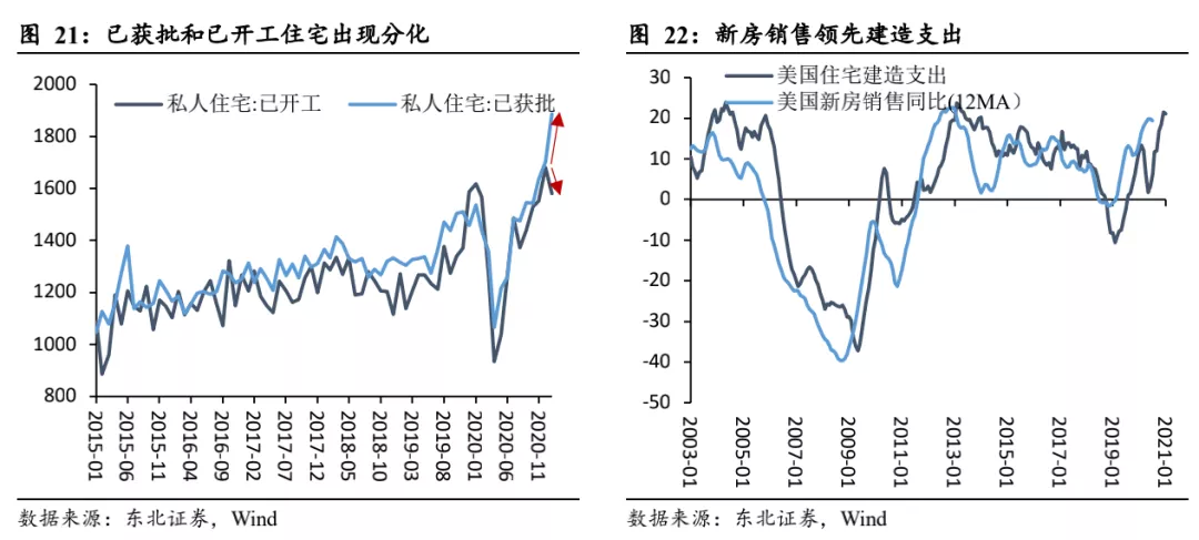 美国已获得批准的新建私人住宅在去年大幅上升,但是已开工的新建私人住宅在近几个月却下降,二者出现少见的剪刀差,这也是疫情和寒潮影响开工的结果。各方面证据表明美国补库存的需求强烈,而开工的意愿又被压制了很久,所以接下来一段时间内建筑开工有较强支撑。