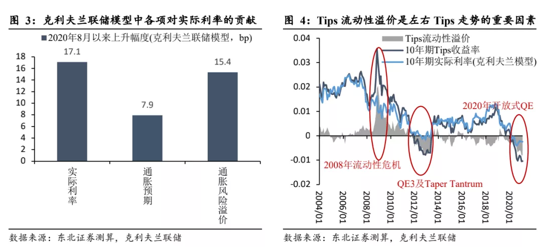 自伯南克以来,美联储一直注重预期管理。从去年无限量QE救市,到后来不断表态不考虑加息,美联储不断向市场释放鸽派信号。市场对于美联储“无限兜底”的预期也导致Tips流动性溢价降至最低点,Tips收益率也因此被压到极低的水平。但今年自年初的“缩减购债”的讨论开始,美联储的态度开始变得相对模糊,也因此造成了市场的较大波动,“缩减购债”的讨论是助推1月初美债收益率上行的重要动力,近期鲍威尔等官员对长债利率波动“淡然处之”的态度则是催化近期美债收益率快速上升的重要原因。随着美联储态度开始模糊,市场对美联储未来的行动产生了怀疑,Tips流动性溢价大幅上升,也是推高Tips收益率的重要原因。