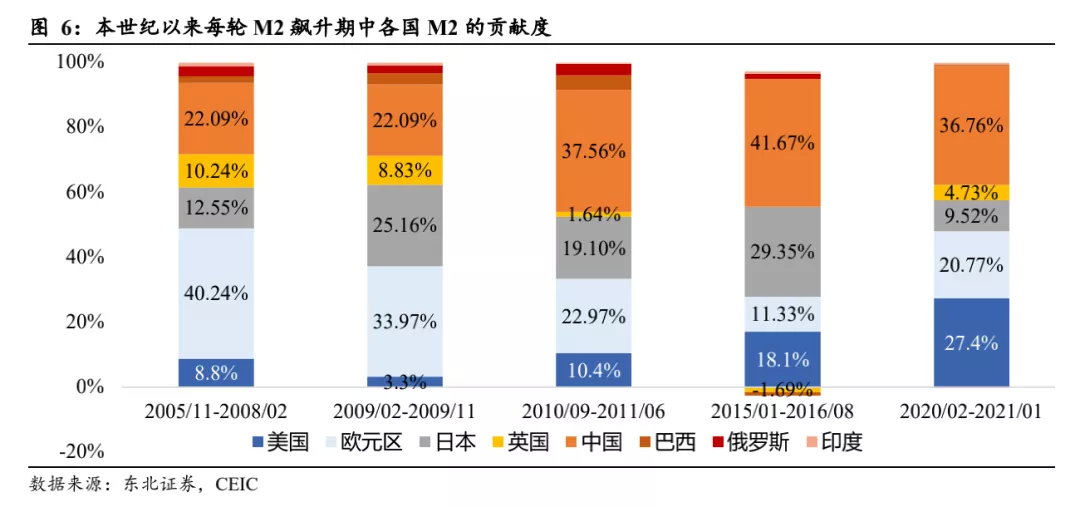 本世纪以来几轮商品牛市均伴随着全球货币供应量的激增,其中2005-2008年及2009年两轮货币放水中贡献度较大的为欧元区,2010-2011年和2015-2016年全球货币供应上升的主要贡献国家是中国。去年新冠疫情爆发以来,中国仍是全球M2上升的最大贡献国家,但其中很重要的原因是人民币汇率的大幅升值。美国在以往几轮放水中对全球M2的贡献实际不大,但本次的作用大幅上升。目前美国M2仍在持续上升的趋势之中,而且美国直接融资的比例较大,没有体现在M2之中但对实体需求的拉动作用很强,所以在这一轮全球放水之中占据主导力量的是美国。