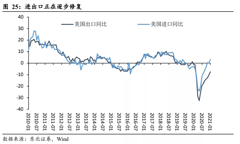 第二,全球贸易正在恢复。疫情期间由于发展中国家工业生产受阻,且国际间物流受阻,美国等发达国家进口大幅下降。而美欧发达国家的低端制造业商品很多依赖于进口,本国产能不足加之进口下降,导致供给不足而造成通胀压力。未来随着全球贸易的恢复,美国产需缺口将逐步缩窄,在一定程度上缓解通胀压力。
