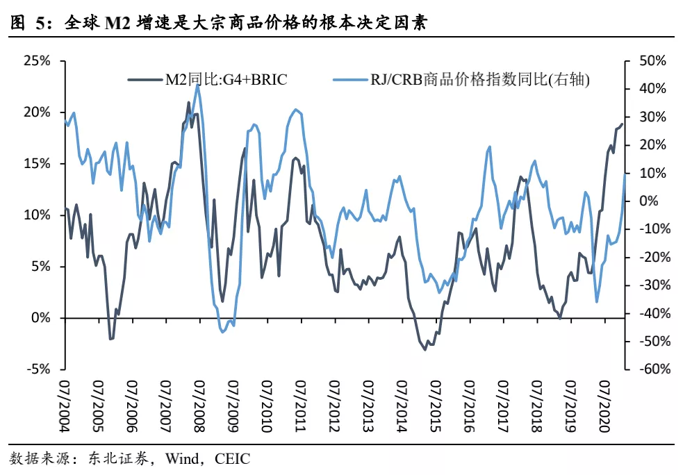 目前全球M2增速已经飙升至十几年来的高位,且作为本轮“水龙头”的美国仍在开闸放水,大宗商品价格仍有上涨的动力。