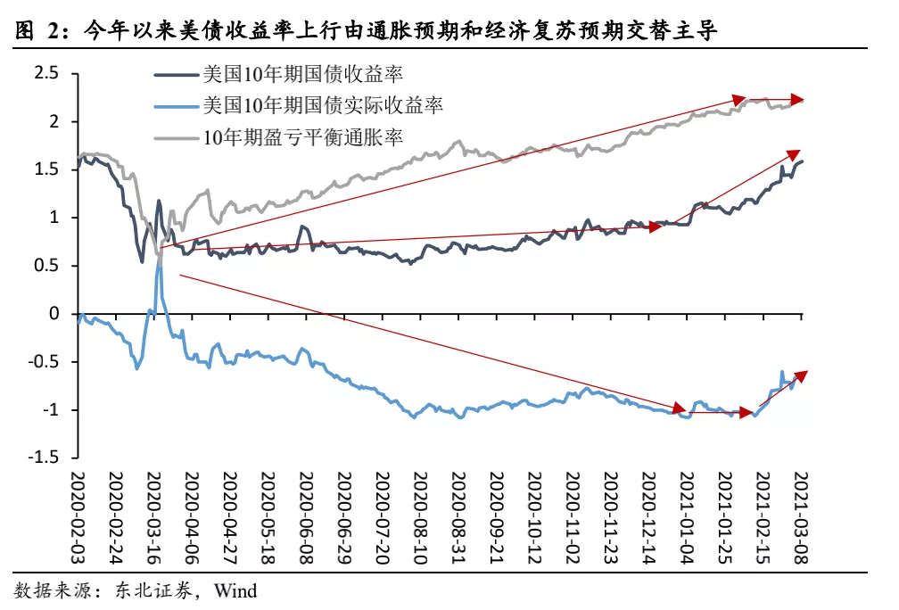 今年1月至2月上旬,实际利率停止下行趋势,而通胀预期继续上升,推动名义利率上行;2月中旬开始通胀预期停止上行,但实际利率快速回升,导致名义利率继续加速上行。决定实际利率的根本因素是经济预期,所以从这一角度来看,今年以来美债收益率上行是由通胀预期和经济复苏预期交替主导的。